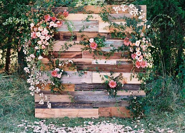 Jika tak ingin terlalu repot saat menata dekorasi rustic, buat backdrop foto dengan menyematkan macam-macam bunga kering agar tercipta tampilan yang menawan. Kenangan pesta pernikahan pun akan diabadikan dengan indah.
