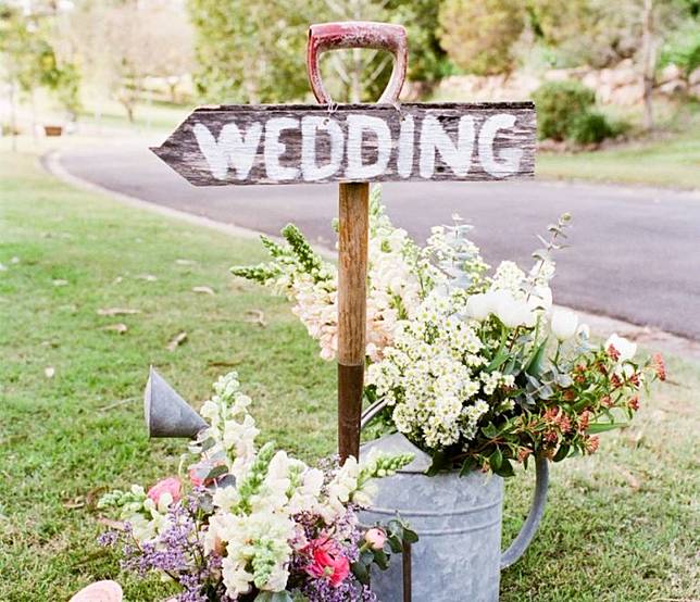 Misalnya saja papan bertuliskan “wedding” pada area pintu masuk. Dekorasi rustic ini dilengkapi dengan penyiram tanaman yang dipenuhi dengan macam macam bunga yang menghiasi pintu masuk.