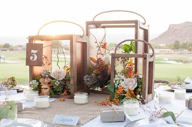 Alih-alih hanya menggunakan bunga sebagai dekorasi rustic pada meja tamu, mengapa tidak melengkapi dekorasi dengan kerangka lentera serta lilin kecil? Tips Kania ialah kamu bisa menambahkan rangkaian lampu hias kecil ke dalam kerangka lentera sehingga saat malam hari, dekorasi rustic ini akan terlihat seperti kunang-kunang menyala.