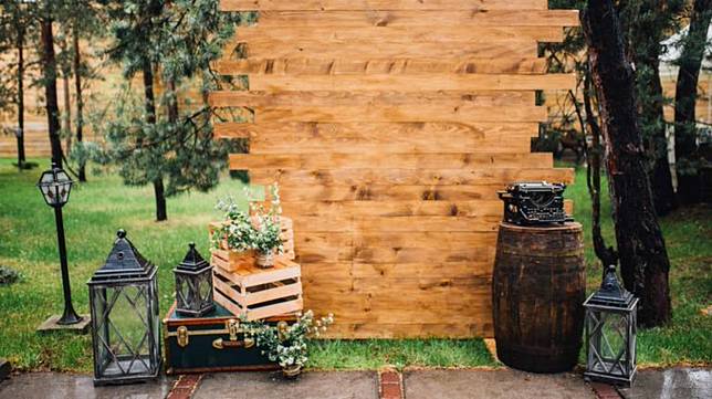 Momen yang sangat berharga di hari pernikahan wajib diabadikan dalam sebuah foto. Buatlah sebuah area khusus berfoto dengan backdrop dekorasi rustic. Susunan papan kayu dengan dekorasi lampu taman di bagian bawah akan terlihat cantik tanpa membutuhkan banyak usaha.